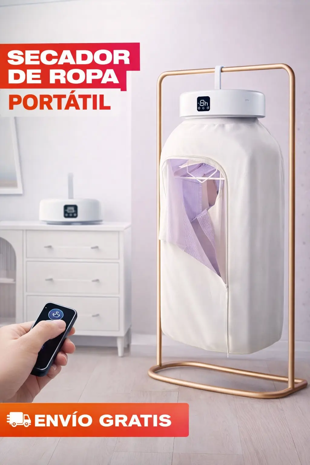 Esta secadora portátil con soporte de nailon resistente tiene capacidad para hasta 9 prendas a la vez y logra un secado rápido en solo 20 minutos.